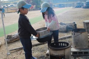 まず子どもたちがコメを研いで