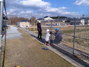 乳児園庭のフェンスが歪んでいたので直してもらっています。