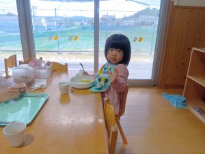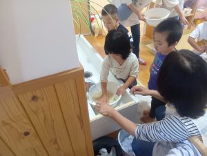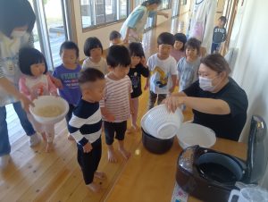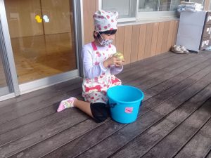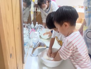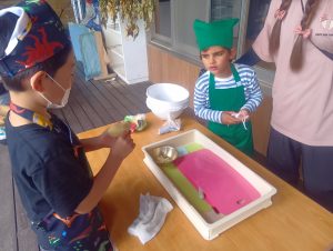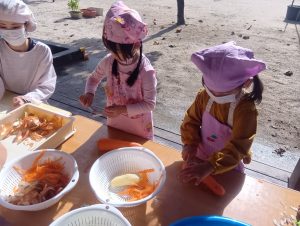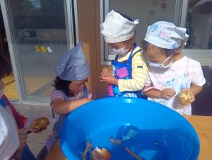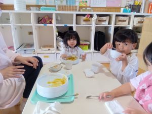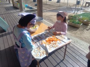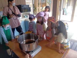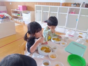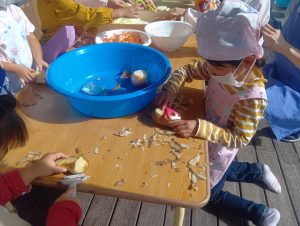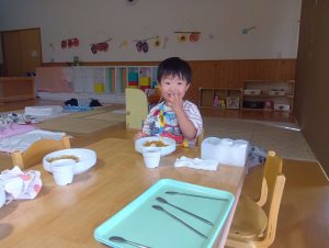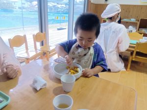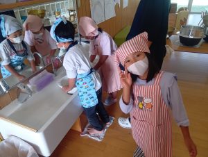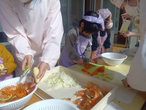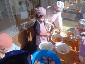 そして、今日はそのフェスティバルの内容の1つにもなりそうな食育の日のクッキングを子どもたちが楽しみました。