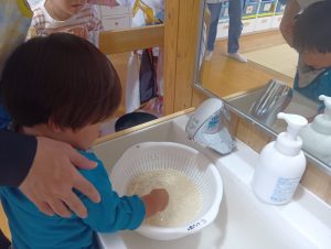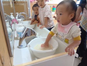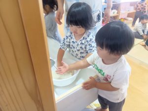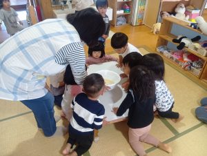 1組の興味のある子がスライムづくりを楽しんでいました。