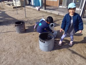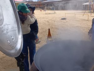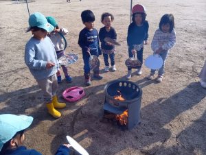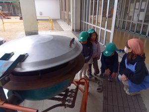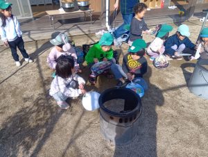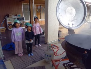 園庭に大鍋を準備して、おでんを作りました。